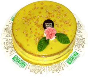 Beskrivning: En klassiker bland tårtor. Saftig sockerkaksbotten fylld med vaniljkräm och en ljuvlig smak av apelsin, florsockerglasyr med syltade apelsinskal.