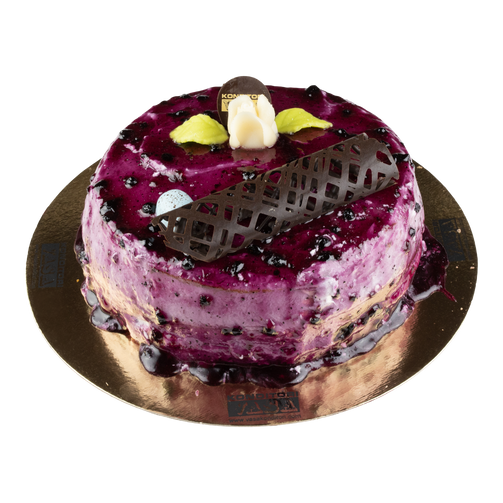 En läcker blåbärstårta som är gjord på en sockerkaksbotten och en underbar fyllning av blåbärssylt, vaniljkräm och rikligt med grädde. Tårtan är garnerad med gelétäckta blåbär.