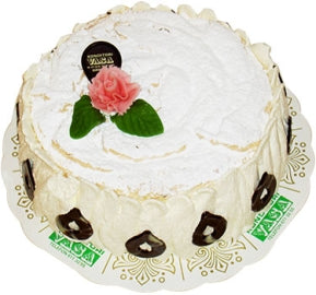 Tårta gjord på sockerkaksanslag och nötmaräng. Fyllningen består av vaniljkräm och hallongrädde som ger både friskhet och sötma. Kantdekorerad med choklad.