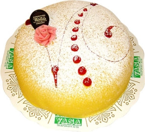 Vasas alldeles egna specialtårta! Tårtan har två olika bottnar: en sockerkaksbotten och en mandelbotten. Lagren varvas med grädde, vaniljkräm och banan. Den dekoreras med gul marsipan och vacker dekor.