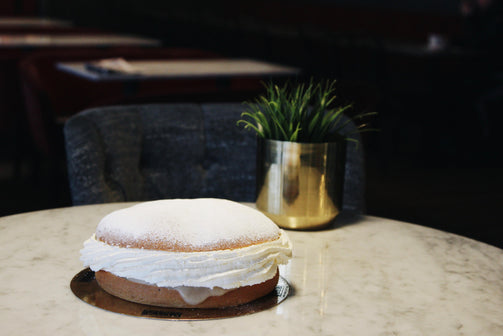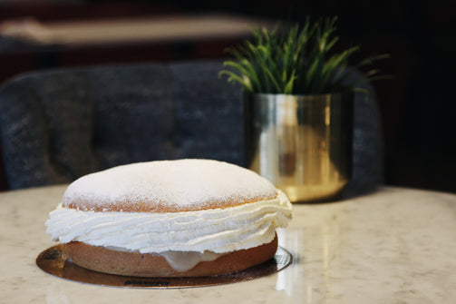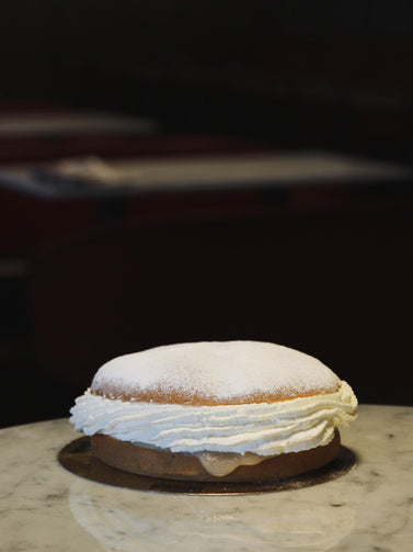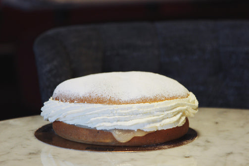 Klassisk semla bakad på sött bröd som fylls med mandelmassa och grädde fast modellen större.